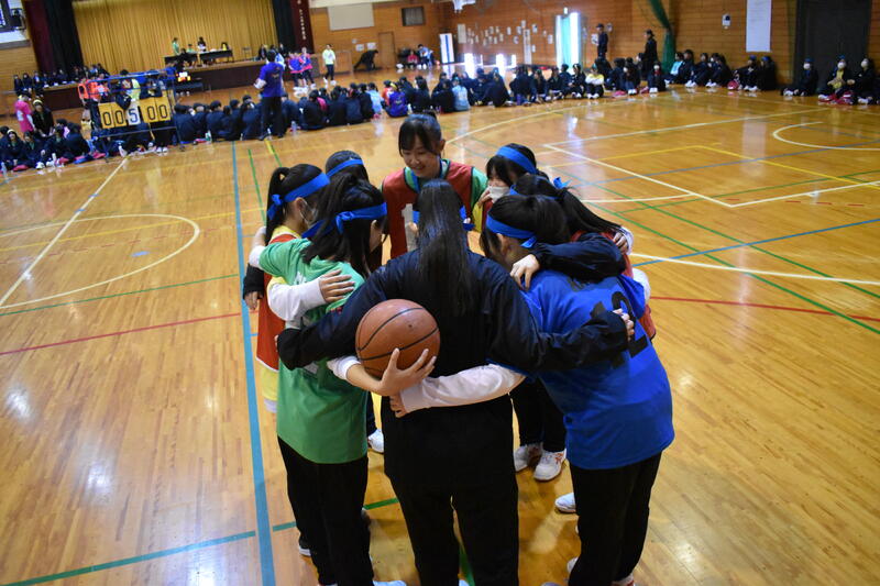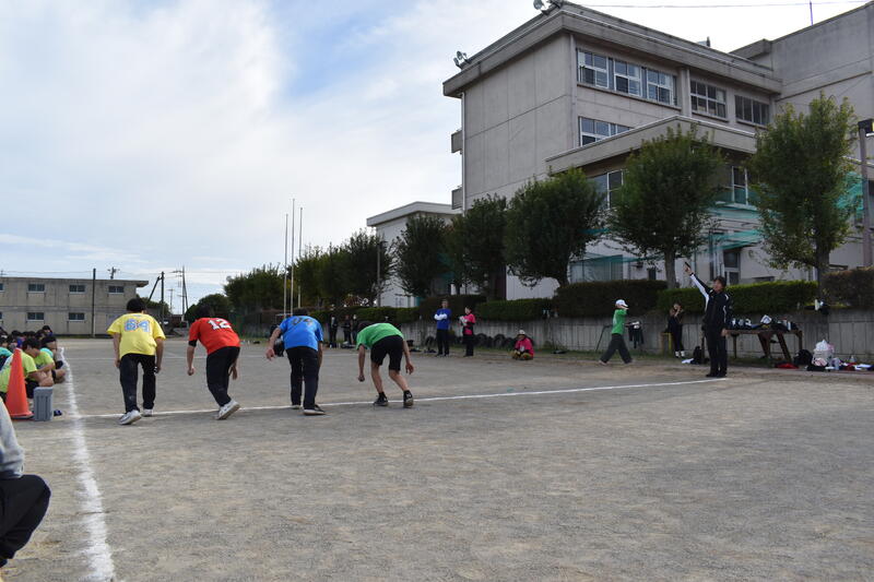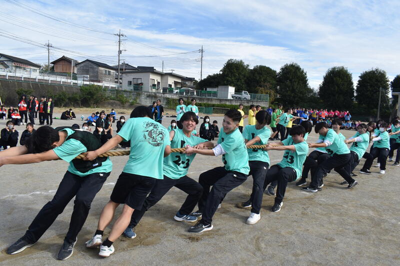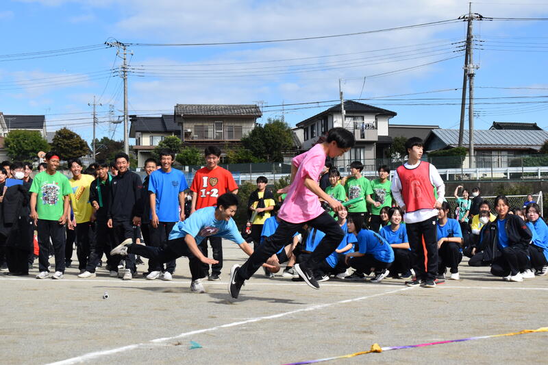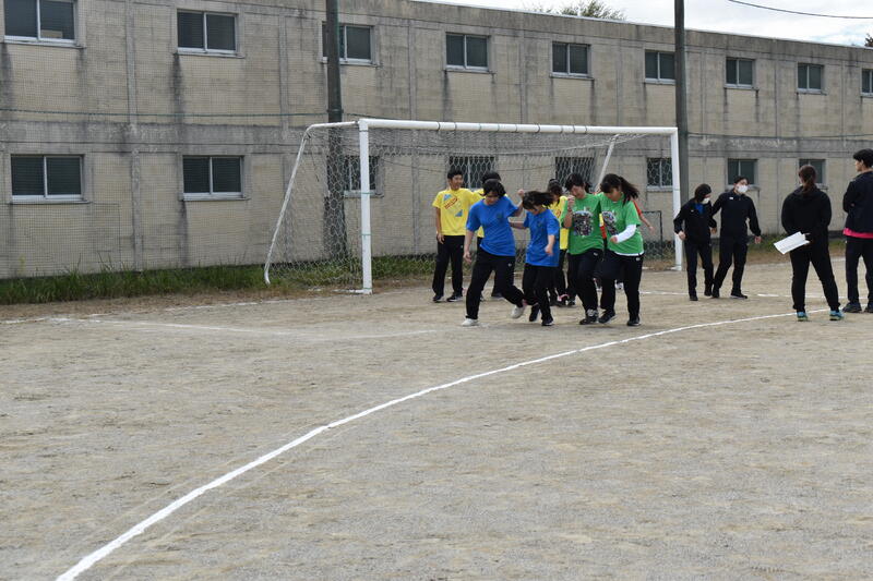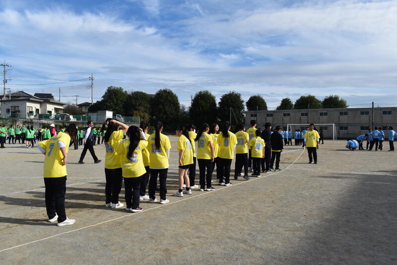 決勝戦が終わると、続けて体育祭が行われました。学年別クラス対抗戦で、種目は玉入れ、二人三脚リレー、選抜リレー、綱引き、長縄、借り物競争、クラス対抗リレーです。特に、選抜リレーやクラス対抗リレーは注目が集まりました。運動が得意な生徒の活躍が目立ちましたが、それ以上にみんなが全力で取り組んでいたことが素晴らしかったです。円陣を組んで士気を上げるクラスや必死に声援を送るクラス、どんな結果でも各クラスが盛り上がっていました。