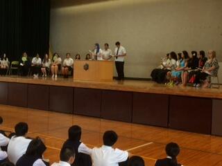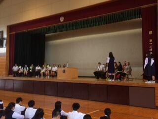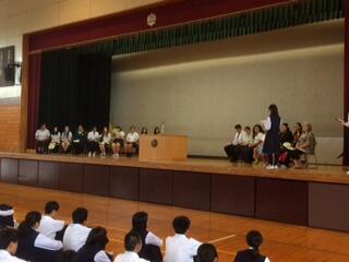 吹奏楽部の伴奏で「ポカレカレアナ」というマオリ語の歌を生徒達が合唱して入場しました。プレゼント交換を行い、本校生徒が作成した高東紹介ビデオを上映しました。マヌレワ高校の生徒や先生方も楽しんでくれた様子でした。その後、吹奏楽部による素晴らしいパフォーマンスを楽しみました。その後、内藤校長に日本剣道形演武を披露していただきました。真剣という意味や間や型の美しさという日本文化を体感できてマヌレワ高校生や先生方も感激していました。最後は、マヌレワ高校生による日本語での説明と動画を観ました。我々が英語で話し、彼らが日本語を話す。お互いの文化を紹介し合えた素晴らしい歓迎式典となりました。